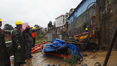 10月9日,施工組冒雨開孔施工,截止晚上7點,完成3根鋼管樁的成孔工作。我院迅速的救災反應、高度的社會責任感、精干的搶險隊伍和過硬的施工組織能力深受木里縣委縣政府領導和社會各界好評。并于10月10日專門邀請甘孜州日報對施工現場進行采訪報道,截止目前專題報道尚在編制中。堅信在省廳、州委、縣委縣政府以及縣國土局的指揮和支持下,通過我院精心組織,精心施工,定能高效優質的完成畜牧局東側滑坡的應急搶險工程,確保木里縣城居民生命安全,還木里一個安全舒適的居住環境。(巖土工程公司 張繼)