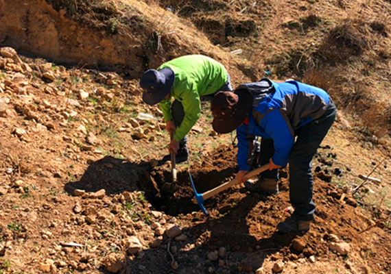 由于卡洛村郎機嶺溝泥石流勘查設計項目地處藏區,語言不通等因素,項目組人員便自行購置鋤頭、鐵鍬等工具,開展槽探和采集樣品工作。頂著高原的烈日,在海拔近4000m的斜坡開展詳細地質調繪和地形圖測量工作,方便米飯和涼水便解決了一日三餐,但項目組人員沒一人喊苦叫累。終于,經過兩天的辛苦工作,項目組順利完成了郎機嶺溝泥石流勘查設計項目野外工作。